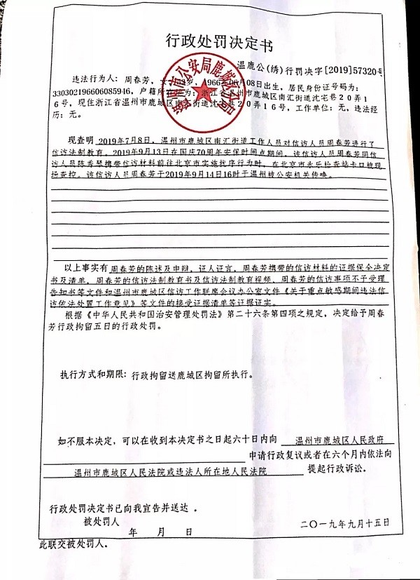 荒唐的行政处罚决定书:温州市公安局鹿城区分局行政处罚决定书(违法行为人、被处罚人周春芳),温鹿公(绣)行罚决字[2019]57320号行政处罚决定书显示时间为:9月14日下午16时于温州被公安机关传唤。
