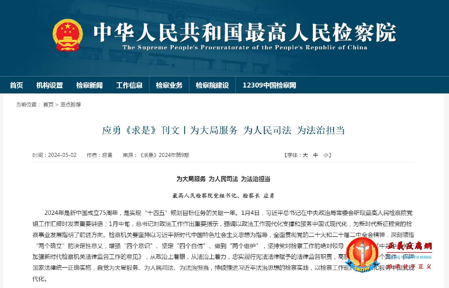 2024年5月2日,最高人民检察院党组书记、检察长应勇《求是》刊文|“为大局服务、为人民司法、为法治担当”,将“为人民服务”标语换成“为大局服务”。(图片来源:最高人民检察院网站 / 截图)