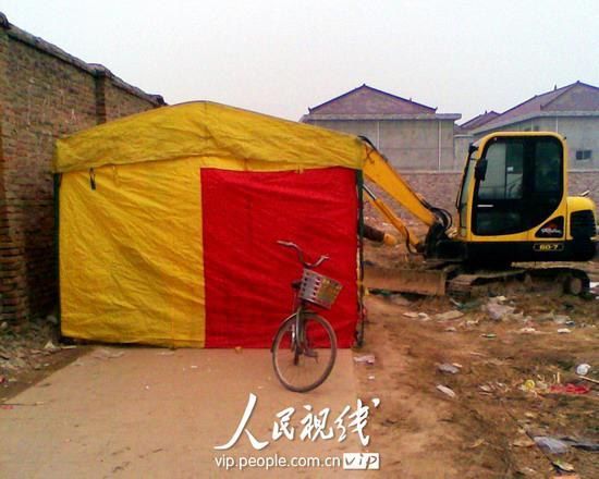 老人们的帐篷紧挨着伸着臂膀的挖掘机。