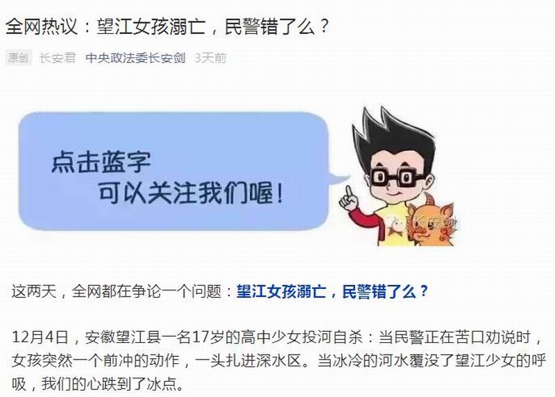 ▲标题为“全网热议:望江女孩溺亡,民警错了么?”(图片来源:中共中央政法委员会微信公众号 / 截图)